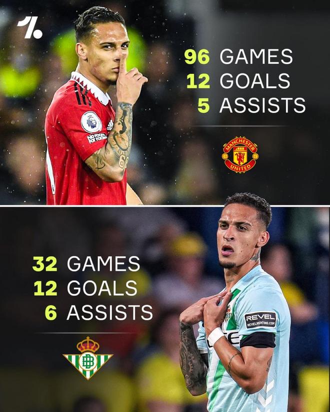 而在本轮西甲梅开二度帮助贝蒂斯2-2战平比利亚雷亚尔后,安东尼在贝蒂斯效力的32场比赛,已经打入12球并有6次助攻,直接参与了18个进球,这也超过了他在曼联96场的数据。